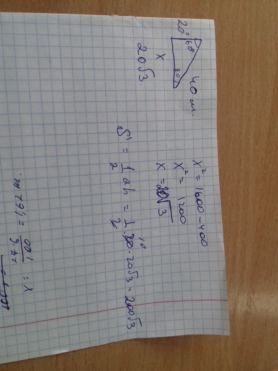 АВС тр-к уг А=60 уг В=90-60=30 АВ=40см ВС=1/2АВ=40/2=20 как катет против 30 Катет АС=кор из1600-400=1200=20кор из30 S=АС*ВС/2=20кор из30*20/2=200кор из30