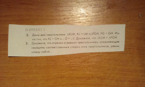 1) KL=LM=FG=GH, ∠L=∠G, значит ΔKLM=ΔFGH по первому признаку равенства треугольников.