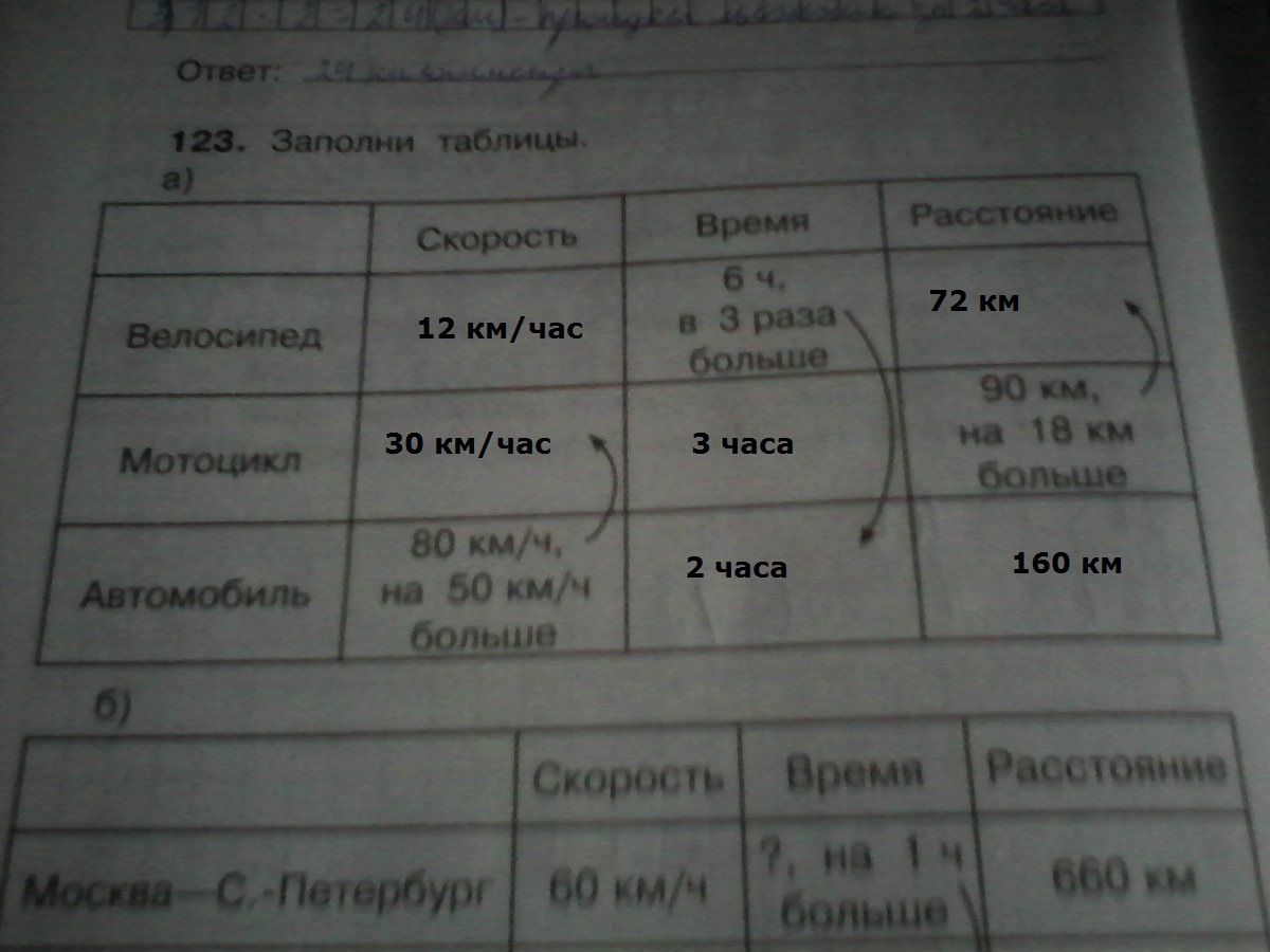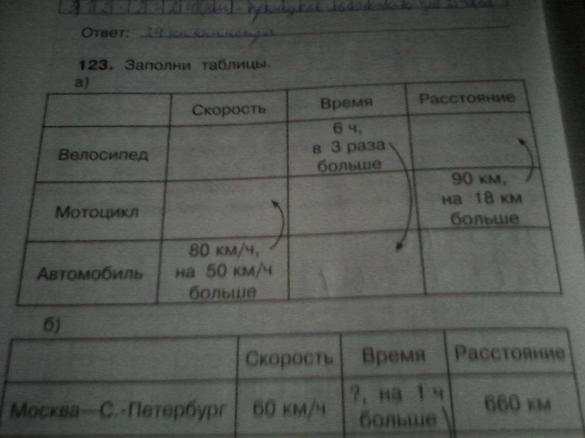 Велосипед 6ч,в 3 раза больше. Мотоцикл 90км на 18км больше. Автомобиль 80км/ч на 50км/ч болше.