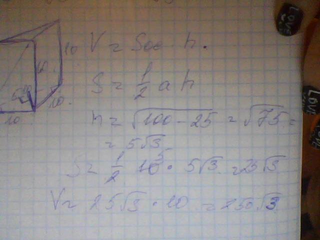 №1. Сторона основания правильной треугольной призмы равна 10 см. Боковые грани – квадраты. Найдите площадь поверхности призмы, ее объем.