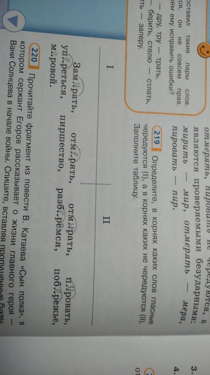 2 колонка: замирать, отмерать, отмирать, пировать, пиршество, разберёмся, меровой.