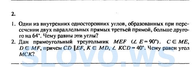 2. так как угол Е прямой, а прямая CD параллельна прямой EF, и соответственные углы равны, то угол MCD будет 90 градусов. угол MCK= угол MCD- угол KCD. следовательно,