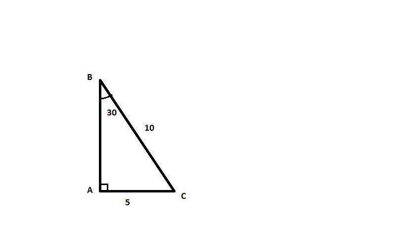 в прямоуг.тр напротив угла в 30 град. лежит катет, равный половине гипотенузы. следовательно, (допустим, в треугольнике ABC с углом C в 90 град. и углом B в 30 град.) катет AC равен 5. по теореме Пифагора получаем, что AB²=AC²+CB². Подставляем значения, и получается, что