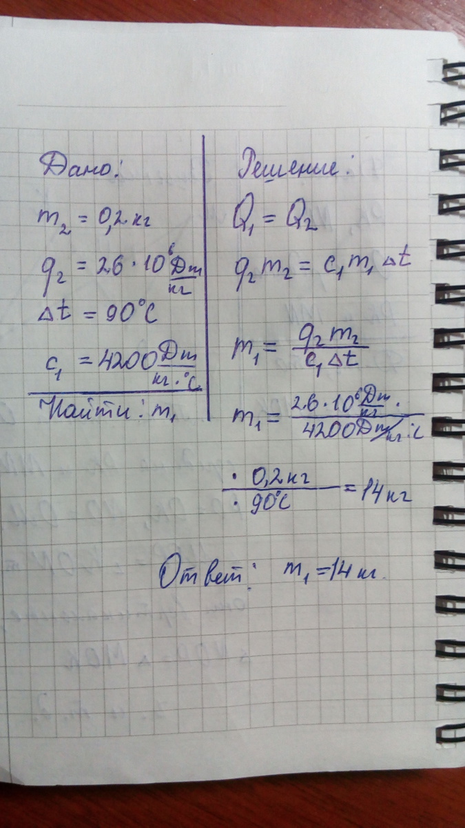 Поскольку вода нагреваясь, поглощает то же количество теплоты, сколько выделяет при сгорании спирт, можно сказать, что Q1=Q2. Запишем это в таком виде: c1m1t=q2m2. Далее выразим отсюда m1 и подсчитаем значение. Все расчеты смотрите на фото. Сверьте с ответами)