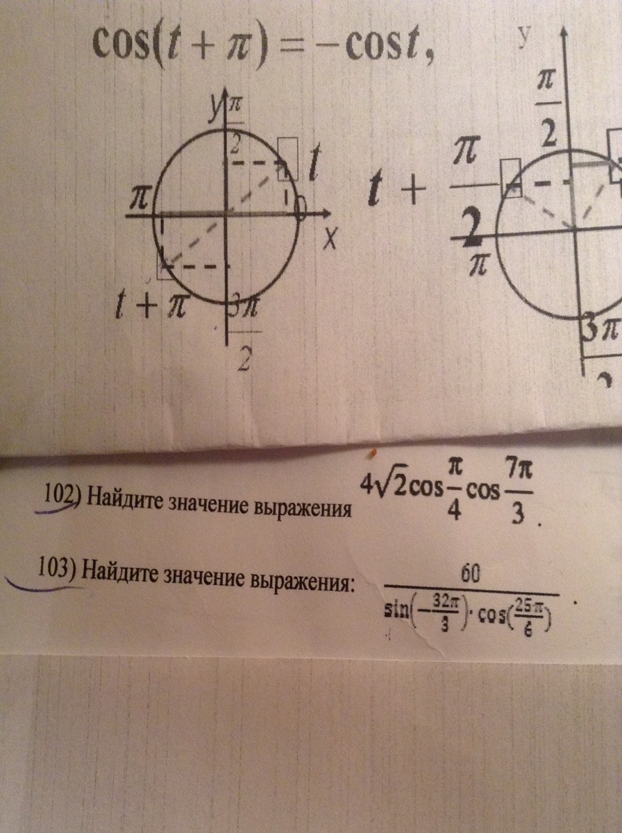 cos(π/4)=√2/2, cos(7π/3)=cos(2π+π/3)=cosπ/3=1/2