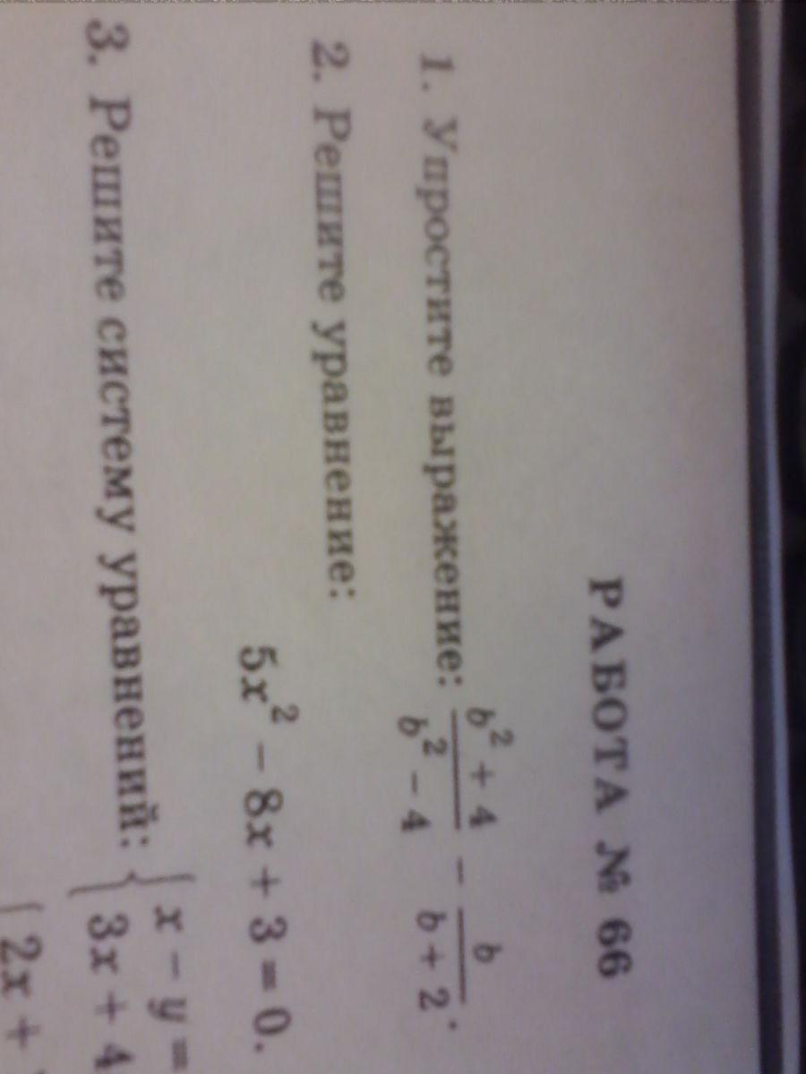 frac{b^2+4}{b^2-4} - frac{b}{b+2}= frac{b^2+4}{(b-2)(b+2)}- frac{b}{b+2} = frac{b^2+4-b(b-2)}{(b-2)(b+2)}= frac{b^2+4-b^2+2b}{(b-2)(b+2)} = frac{2b+4}{(b-2)(b+2)} frac{2(b+2)}{(b-2)(b+2)}= frac{2}{b-2}