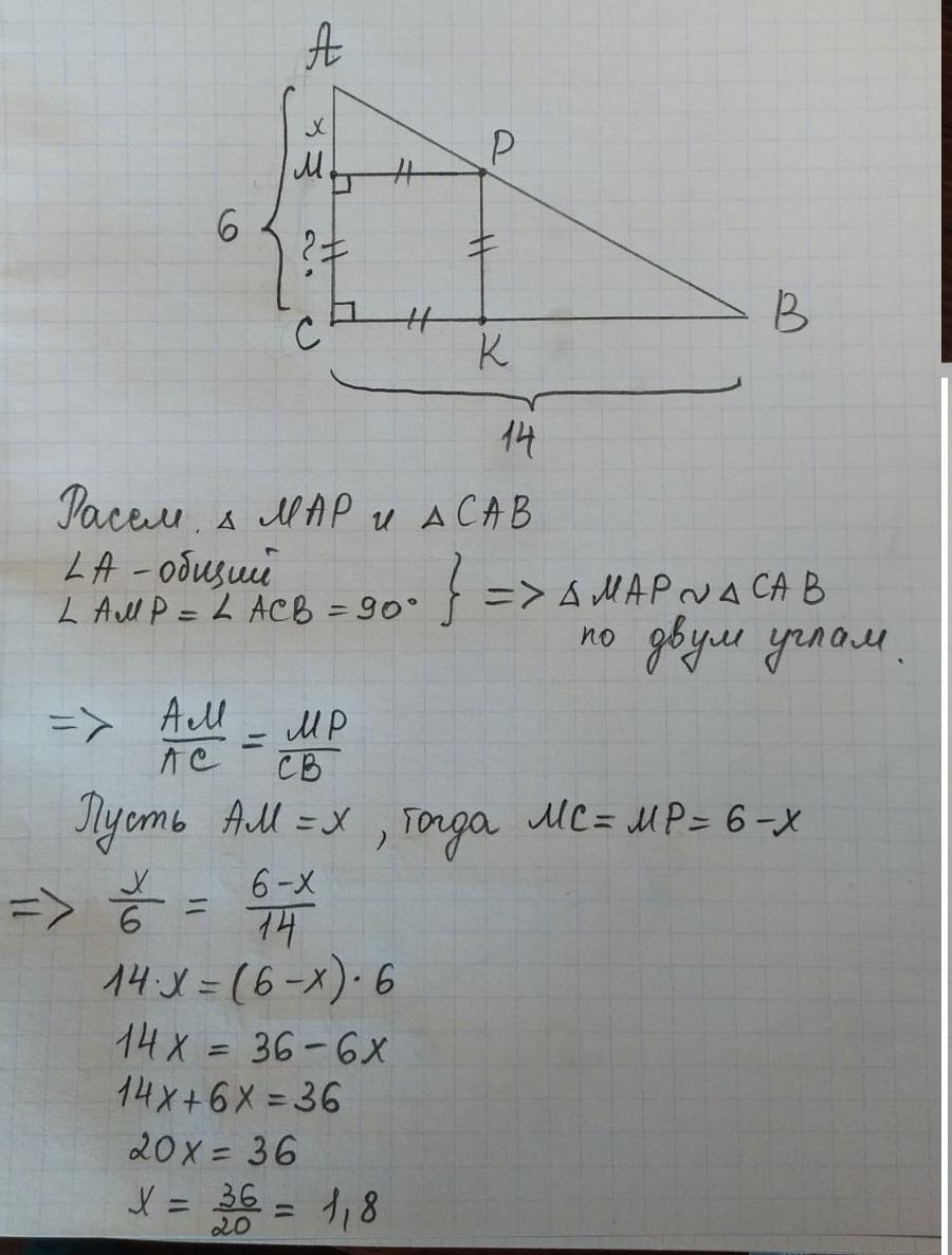 В треугольнике ABC угол C=90гр. На сторонах AC,AB,BC соответственно взяты точки M,P,K,так что четырёхугольник CMPK является квадратом. AC=6см, BC=14см. Найдите сторону MC.
