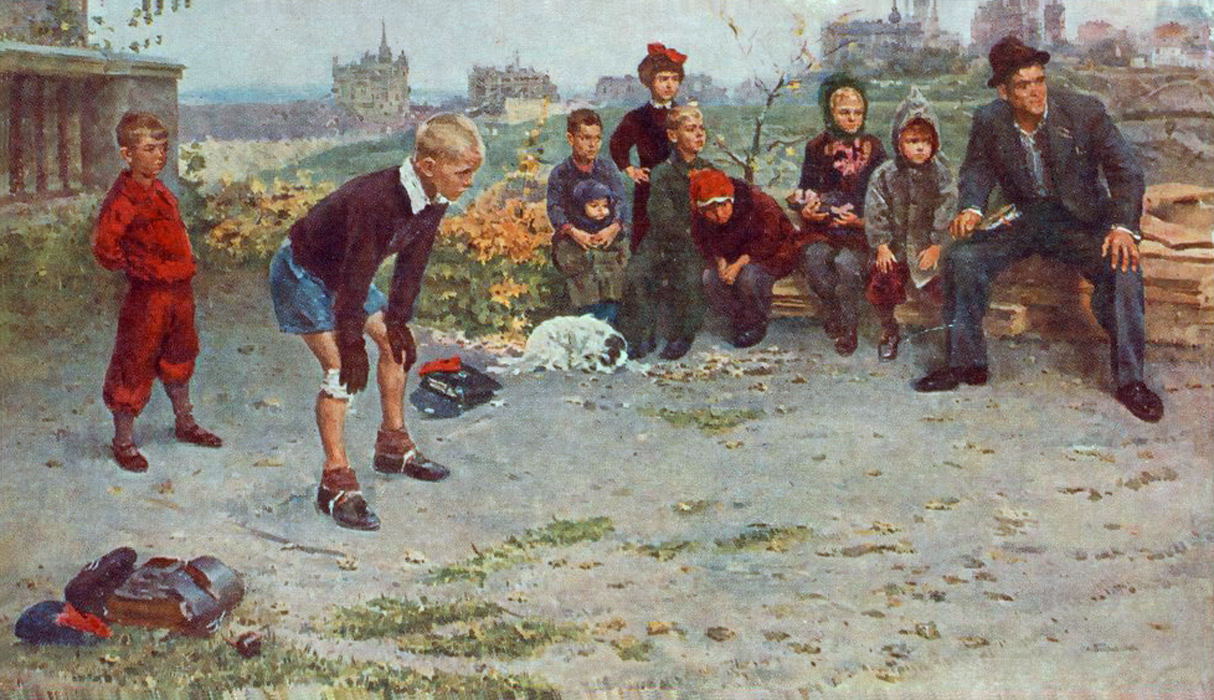 За игрой наблюдает детвора и взрослый мужчина. В глазах мужчины виден задор. Скорее всего, он вспомнил свое детство. Ребята же решили начать игру сразу же после уроков. Они сложили свои школьные принадлежности прямо на землю. Болельщики страстно ловят взглядом каждое действие игроков. Картина Григорьева очень светлая и радостная. Игра - это всегда весело, задорно, азартно.