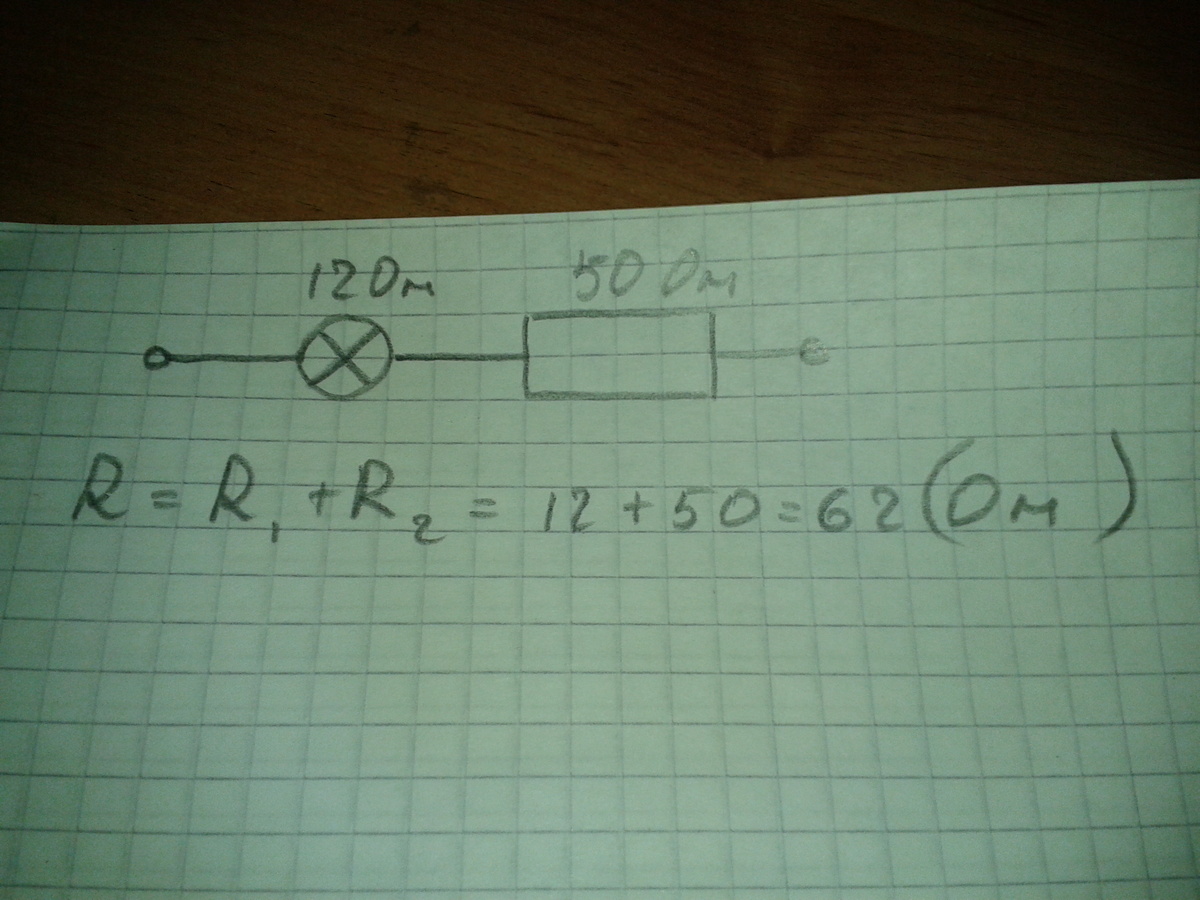 последовательно с электрической лампочкой сопротивлением 50 ом включен резистор сопротивление которого 12 ом , начертите схему этого соединения и опредилите их общее сопротивления