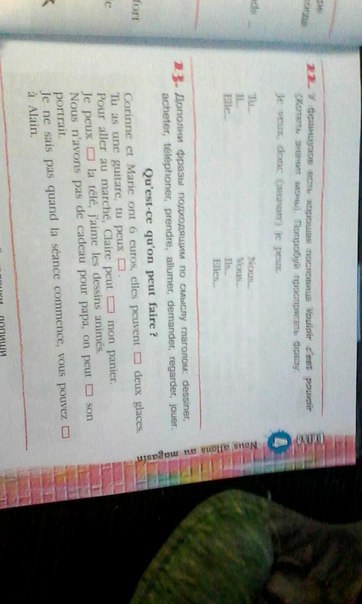 3) Для того, чтобы прогуляться, Клэр может взять мою корзинку. (prendre) 4) Я могу посмотреть телевизор, мне нравятся мультфильмы. (regarder) (можно использовать allumer (включить)