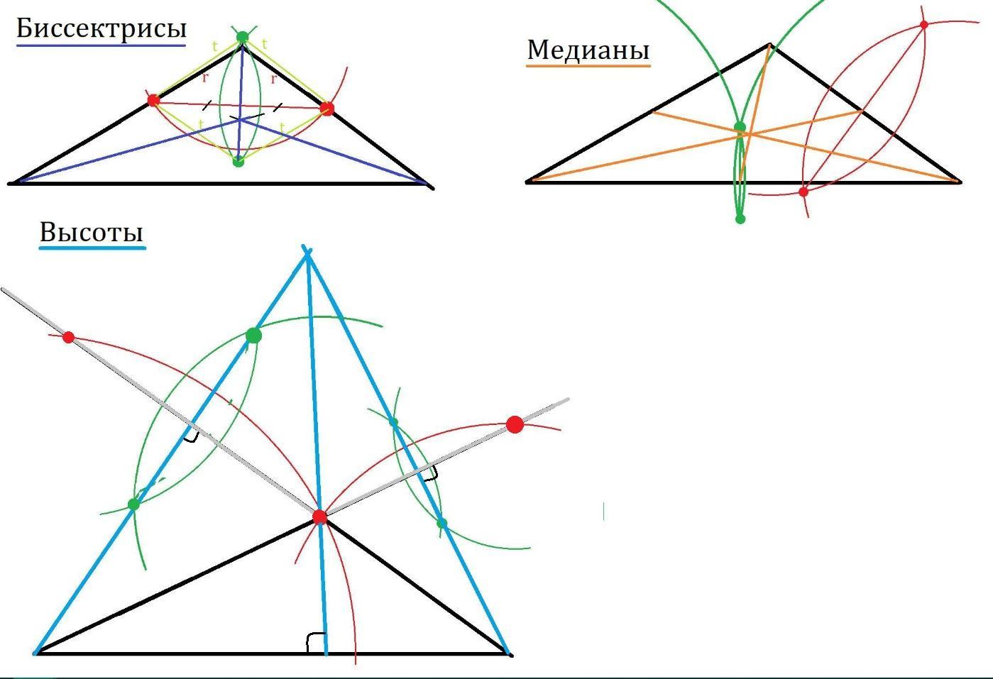 Биссектриса делит угол на два равных угла, чтобы её построить надо из вершины угла провести полуокружность радиусом r, она пересечёт стороны угла в двух точках, соединяем эти точки получаем отрезок. Теперь надо найти середину этого отрезка, для этого с каждого конца проводим полуокружности радиусом t при этом радиус должен быть зрительно больше половины (можно взять всю длину отрезка) эти две полуокружности пересекутся в двух точках, соединяем их, получается прямая которая пересекает отрезок в середине и соединяется с вершиной исходного угла. Это работает потому, что мы построили равнобедренный треугольник и восстановили серединный перпендикуляр (т.к. соединив две точки полуокружностей мы провели диагональ ромба, которая пересекает вторую под прямым углом), а в равнобедренном треугольнике высота проведённая к основанию является и биссектрисой. Аналогично делаем для второго угла, а третью биссектрису можно провести, соединив пересечение двух других и вершину соответственного угла т.к. все биссектрисы в треугольнике пересекаются в одной точке.