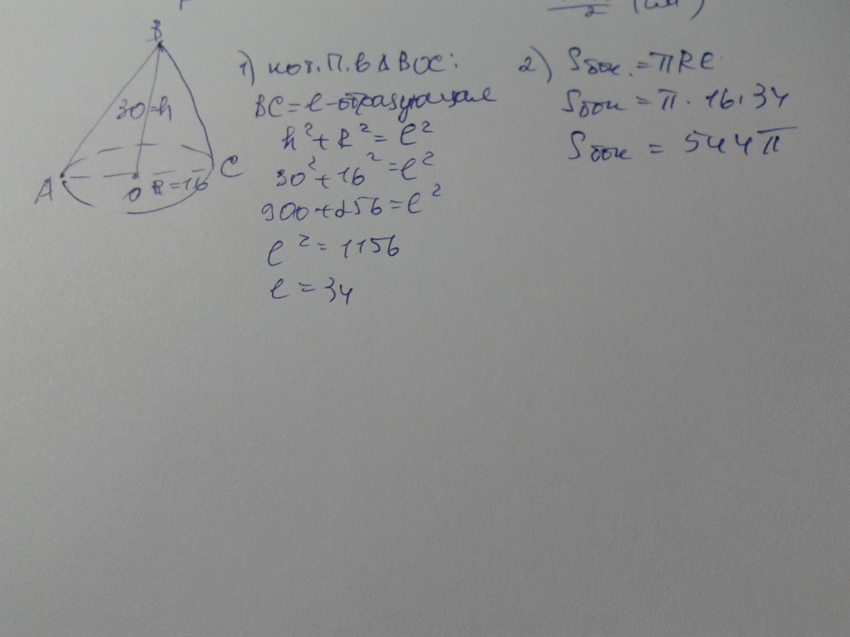 Дано, что высота конуса равна 30 ед.изм., радиус основания конуса — 16 ед.изм. Найди площадь боковой поверхности конуса.