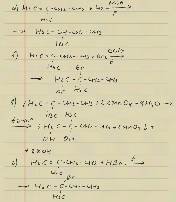 Составьте уравнения реакций между 2-метилбутеном-1 и следующими веществами: