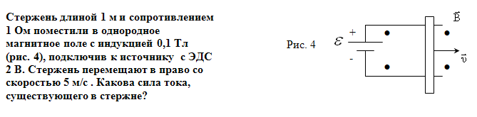 Стержень длиной 1 м и сопротивлением 1 Ом поместили в однородное магнитное поле с индукцией 0,1 Тл (рис. 4), подключив к источнику с ЭДС 2 В. Стержень перемещают в право со скоростью 5 м/с . Какова сила тока, существующего в стержне?