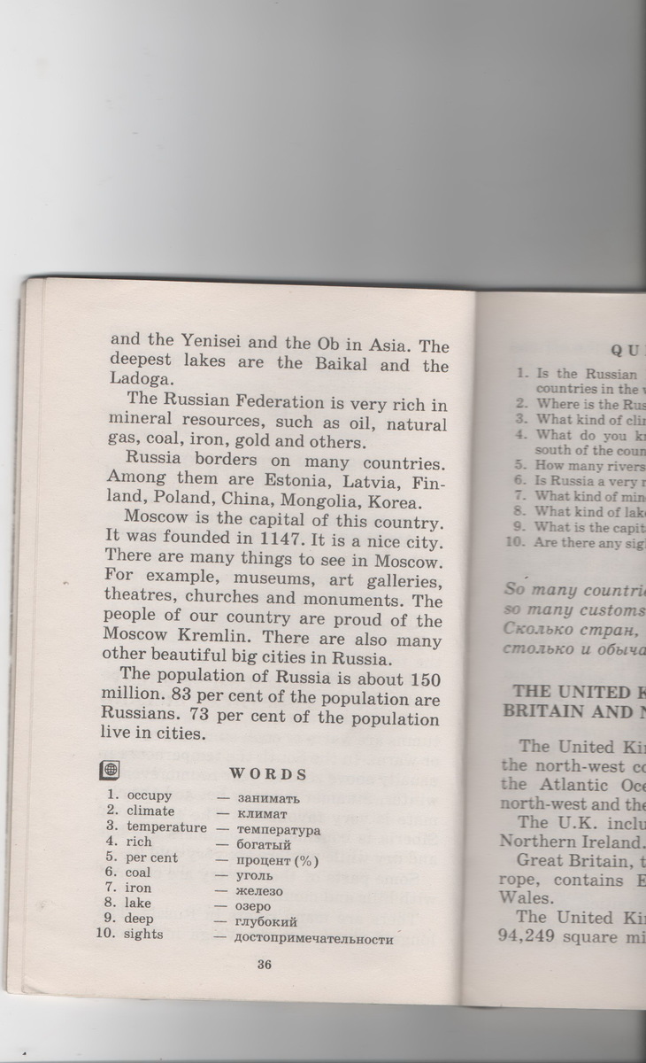 и Енисея и Оби в Азии. Самые глубокие озера Байкал и Ладога. Россия является очень богатой минеральными ресурсами, такими как нефть, природный газ, уголь, железо, золото и другие. Россия граничит со многими странами. Среди них: Эстония, Латвия, Финляндию, Польшу, Китай, Монголия, Корея. Москва является столицей этой страны. Он был основан в 1147 году. Это хороший город. Есть много вещей, чтобы видеть в Москве. Например, музеев, художественных галерей, театров, церквей и памятников.Народ нашей страны гордятся Московского Кремля. Есть также много других красивых больших городов в России.Население России составляет около 150 млн. долл. США. 83 процентов населения составляют русские. 73 процентов населения проживает в городах.
