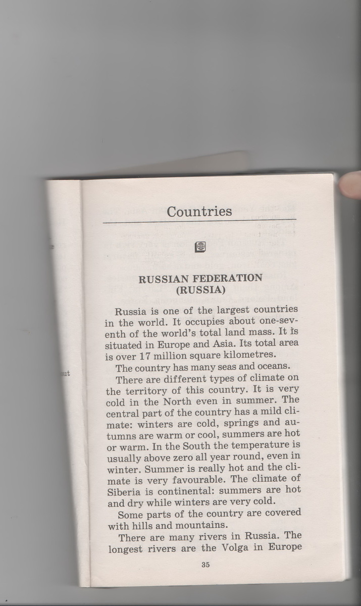 РОССИЯ ФЕДЕРАЦИИ (РОССИЯ) Россия является одной из крупнейших стран в мире. Она занимает около одной несколь-ENTH из общей массы земель в мире. Она расположена в Европе и Азии. Его общая площадь составляет более 17 миллионов квадратных километров. В стране много морей и океанов. Существуют различные типы климата на территории этой страны. Это очень холодно на Севере даже летом. В центральной части страны, имеет мягкий климат: зима холодная, пружины и Au-tumns теплые или холодные, лето горячей или теплой. На юге температура обычно выше нуля круглый год, даже зимой. Летом очень жарко и климат очень благоприятный.Климат Сибири резко континентальный: лето жаркое и сухое, а зима очень холодная. Некоторые районы страны покрыта холмами и горами. Есть много рек в России. Самые длинные реки Волга в Европе.