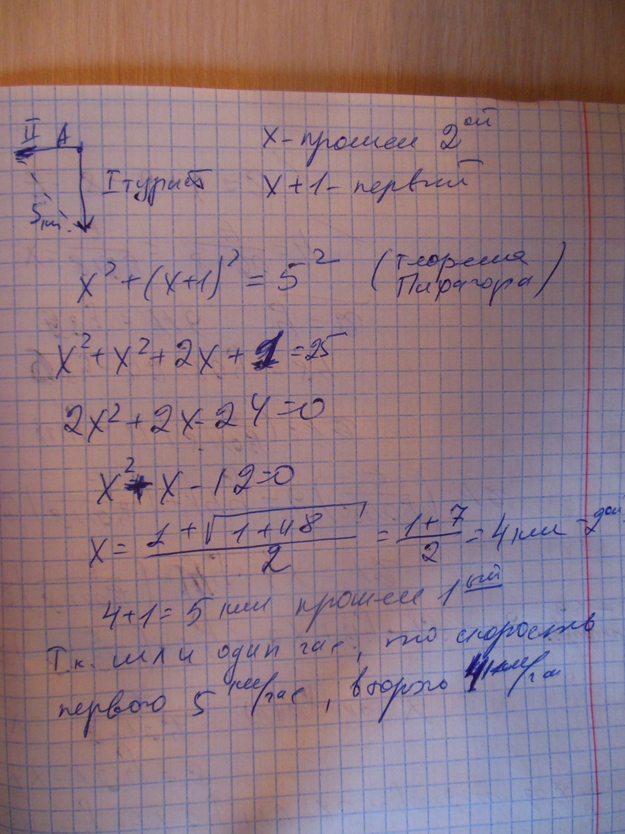 Из города А вышло одновременно два туриста один направился на юг,а другой на запод.Через час расстояние между ними стало равно 5 км,причем первый турист прошол на 1 км больше,чем второй.С какой скоростью шел второй турист?