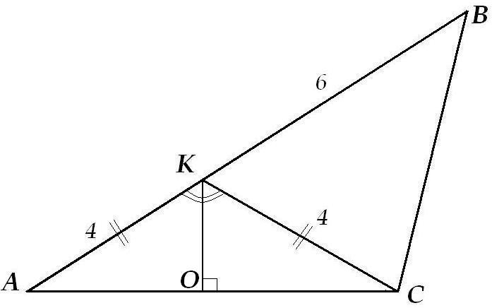 Точка К лежит на стороне АВ треугольника АВС. Найдите угол между биссектрисой угла АКС и прямой АС, если АВ=10см, СК=4см, ВК=6см