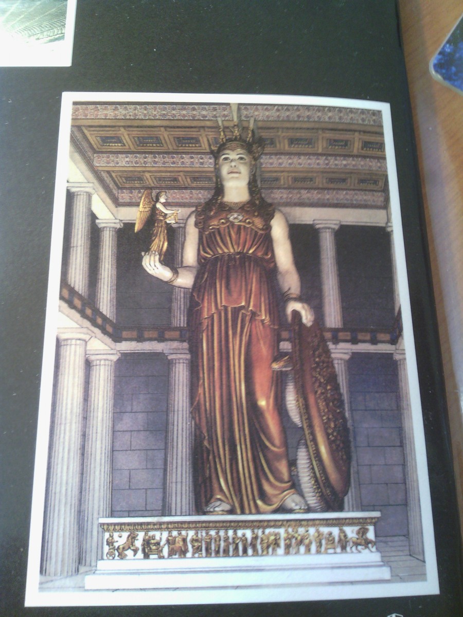 Это Афина - богиня войны, тактики,мудрости у греков .Имя создателя-Фидий.В правой руке Афины изображена богиня победы - Ника.По представлению греков Афина выглядела девой-воительнецей.Они изображали ее с мечом и щитом в руках,с короной на голове и с небольшой статуей в правой руке.Оджда была сзделана из золота,а обнаженные части тела из слоновой кости цвета человеческого тела.Глаза Афины выглядили как глаза живой женщины потому, что они были выполнены из драгоценных камней. На щите то ли змеи, то ли совы ( символы мудрости). Судя по всему именно этот щит ( в смысле щит Афины) использовался против медузы-горгоны, которая своим взглядом все превращала в камень.
