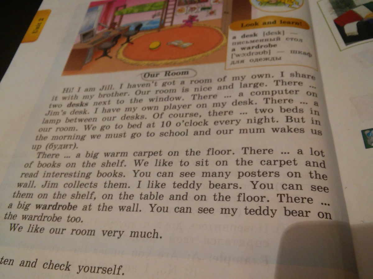 Привет я Джил. у меня нет своей собственной комнаты. я разделяю её со своим братом. Она милая и большая. Около окна две парты. на парте Джима стоит компьютер у меня есть мой собственный плеер на моей парте. Между нашими партами стоит лампа. Конечно в нашей комнате две кровати. Мы ложимся спать в 10:00 вечера каждый день. Но утром мы должны идти в школу и наша мама нас будит. На полу большой тёплый ковёр. На полке много книг. Мы любим сидеть на ковре и читать интересные книжки. На стене вы можете увидеть много плакатов. Джим коллекционирует их. Мне нравится плюшевые мишки. Вы можете выйти в на полках ,на столе и на полу. Около стены большой шкаф. Вы также можете увидеть мою плюшевого медвежонка на нём. Нам очень нравится наша комната.