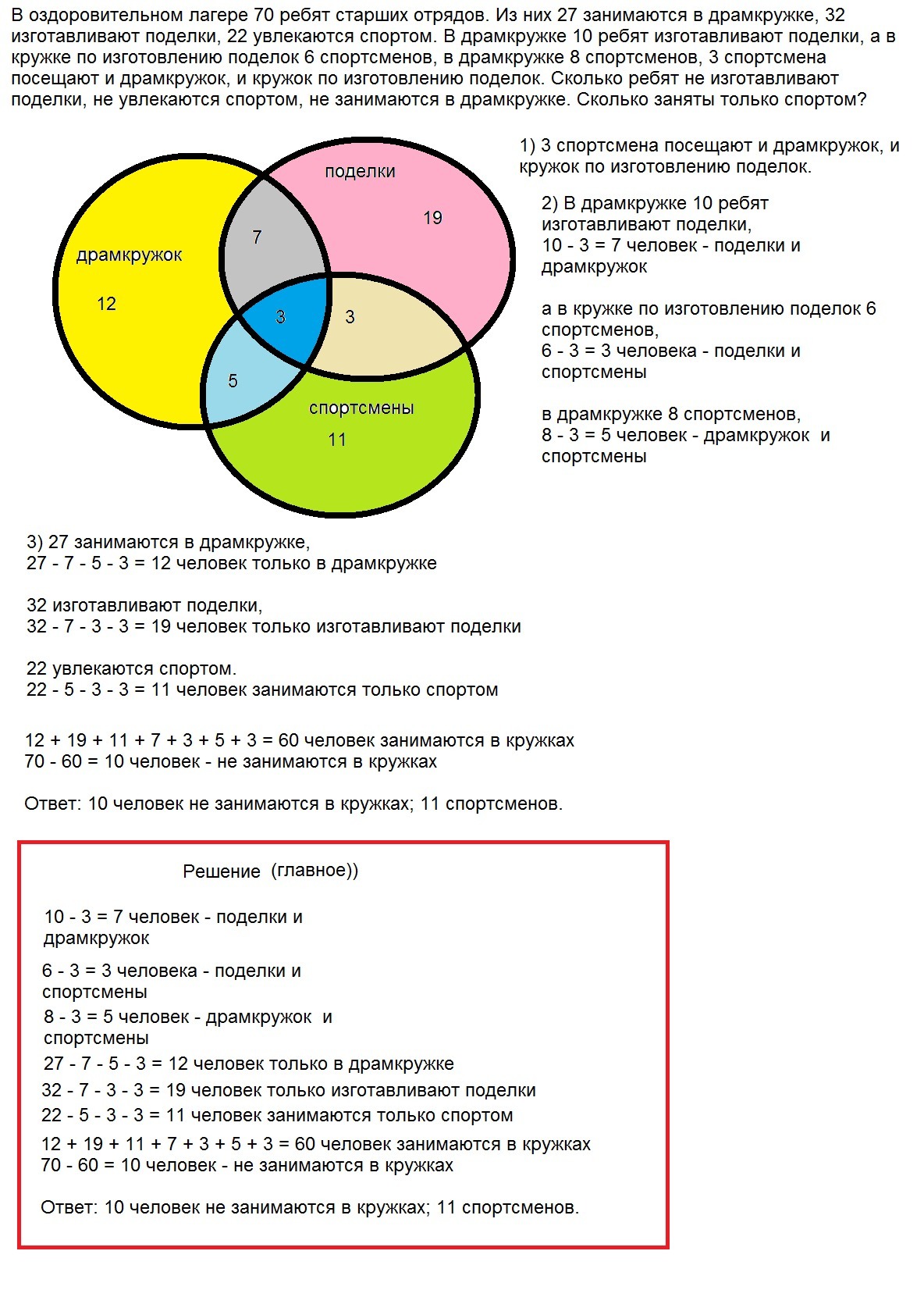 В оздоровительном лагере 70 ребят старших отрядов. Из них 27 занимаются в драмкружке, 32 изготавливают поделки, 22 увлекаются спортом. В драмкружке 10 ребят изготавливают поделки, а в кружке по изготовлению поделок 6 спортсменов, в драмкружке 8 спортсменов, 3 спортсмена посещают и драмкружок, и кружок по изготовлению поделок. Сколько ребят не изготавливают поделки, не увлекаются спортом, не занимаются в драмкружке. Сколько заняты только спортом?