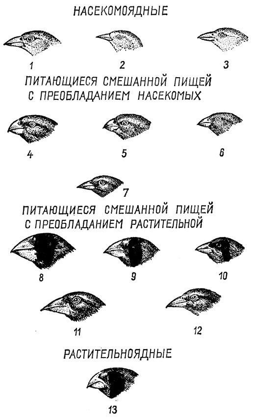 здесь проявляется ПРИСПОСОБЛЕНИЕ животных к окружающей среде, ЕСТЕСТВЕННЫЙ ОТБОР, и ДИВЕРГЕНЦИЯ ( (от средневекового лат. divergo — отклоняюсь)— расхождение признаков и свойств у первоначально близких групп организмов в ходе эволюции, результат обитания в разных условиях и неодинаково направленного естественногоотбора, например вьюрки Дарвина)