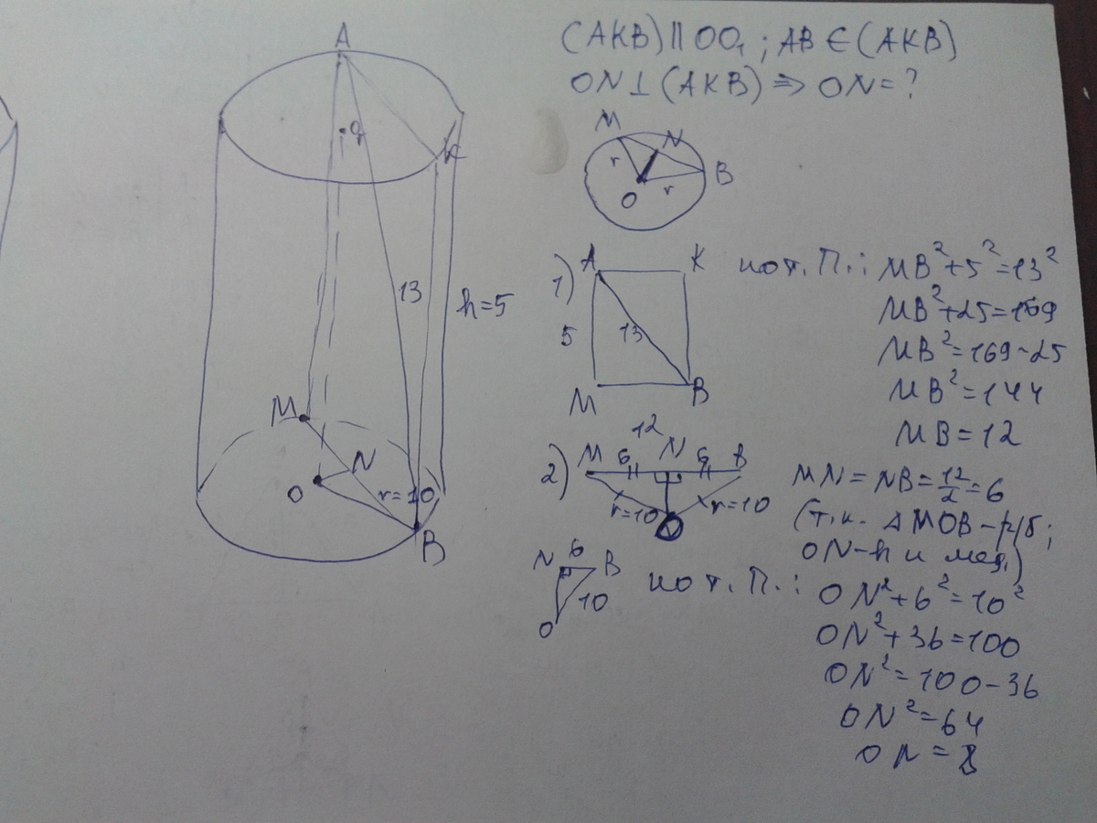На окружностях обоих оснований цилиндра выбрано по точке, расстояние между которыми равно 13. Найдите расстояние от этого отрезка до оси цилиндра , если высота цилиндра равна 5 , а радиус основания равен 10.