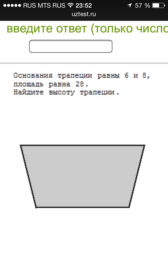 Площадь трапеции равна полусумме оснований на высоту, то есть S=a+b/2 * h. 28= 6+8/2 * h, 28=7*h, h= 4 см