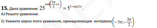 25^{cos(frac{3pi}{2}+x)}=5^{1-cos2x}\\5^{2sinx}=5^{1-cos2x}\\2sinx=1-cos2x; ,; ; 1-cos2x=2sin^2x\\2sin^2x-2sinx=0; ,; ; 2sinx(sinx-1)=0\\1); sinx=0; ,; x=pi n,; nin Z\\2); sinx=1; ,; x=frac{pi}{2}+2pi k,; kin Z\\3); xin (-5pi ;-frac{3pi}{2}); ,; ; x=-4pi,; -frac{7pi }{2}; ,; -3pi ; ,; -2pi ; .