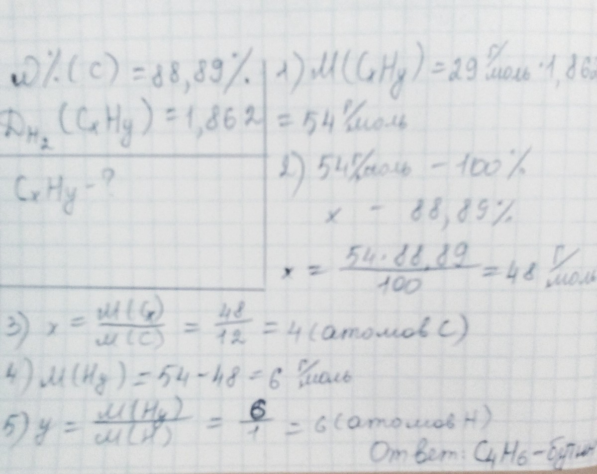 Массовая доля углерода в углеводороде равна 88,89%.Его плотность по воздуху равна 1.862.Найти молекулярную формулу этого вещества.