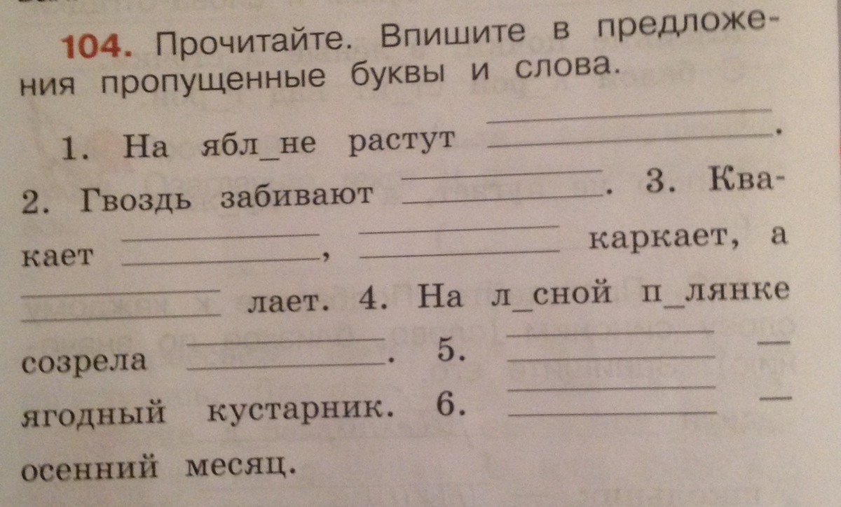 На яблоне растут яблочки. Гвоздь забивают строители. Квакает лягушка, ворона каркает, а собака лает. На лесной полянке созрела земляника. Смородина - ягодный кустарник. Сентябрь - осенний месяц.