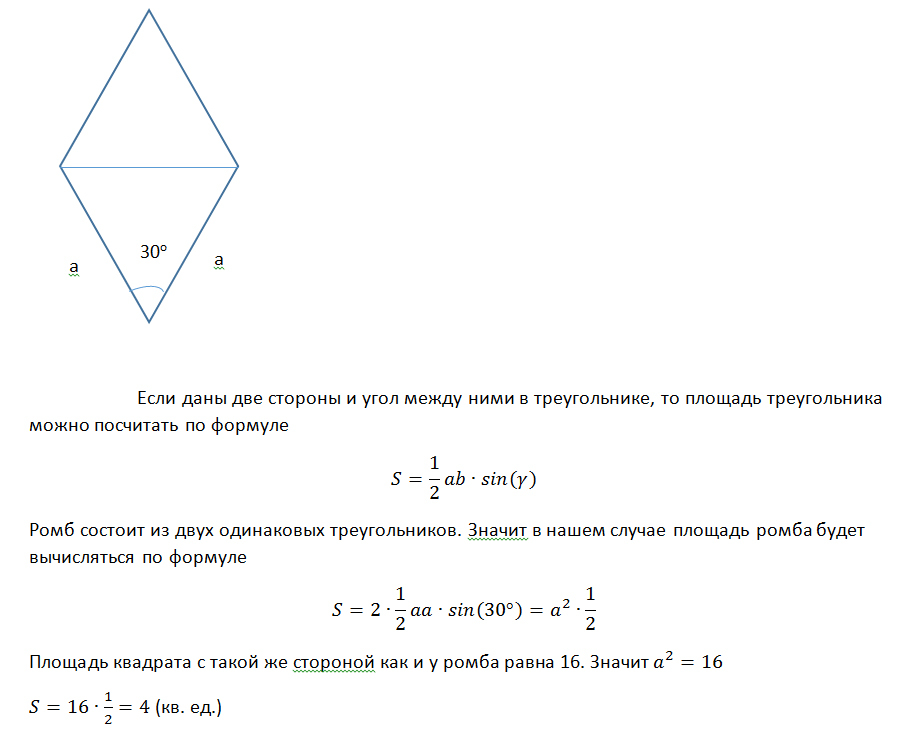 ромбик и квадрат имеют одинаковые стороны Найдите площадь ромба если его острый угол равен 30 градусов а площадь квадрата равна 16