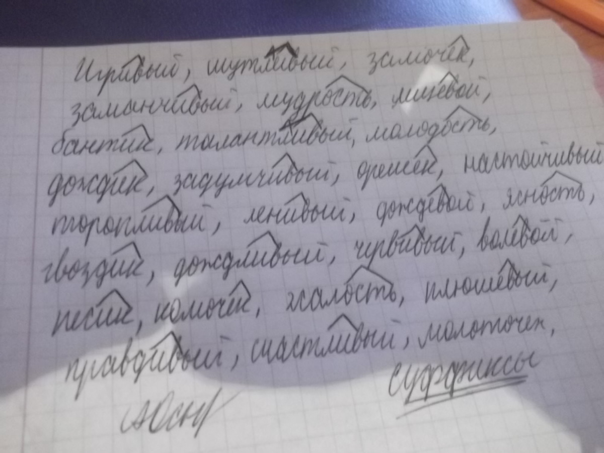Обозначите суффиксы : игривый , шутливый , замочек, заманчивый , мудрость , лицевой ,бантик , талантливый , молодость , дождик , задумчивый , орешек ,