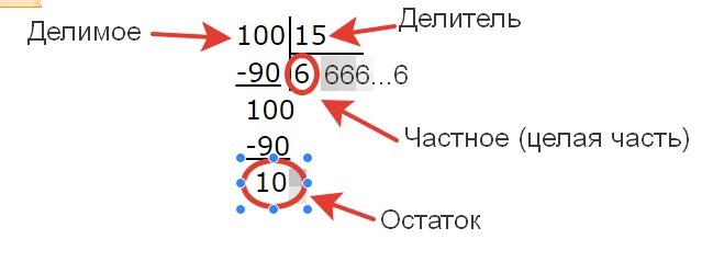 Во вложении этот пример 100/15=6 (остаток 10) решен столбиком,