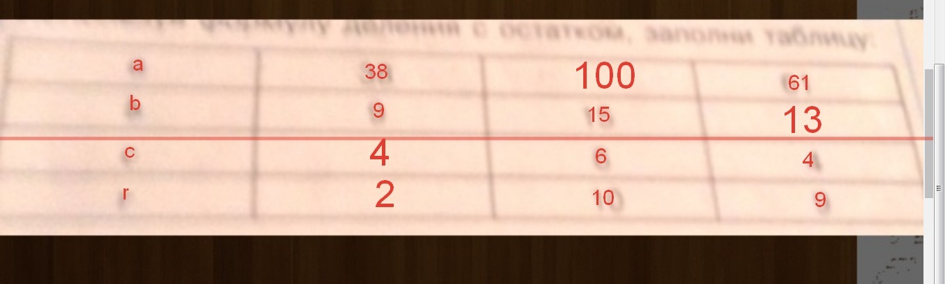 Помогите решить. Используя формулу деления с остатком ,заполни таблицу а=38,б=9,с не дано,r не дано, 2) а не дано, б=15,с=6,r=10, 3) а=61,б не дано,с=4,r=9 Как решить,подскажите пожалуйста!!!!