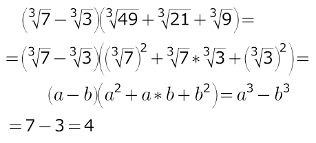 ((Корень 3 степени из 7 - корень 3 степени из 3)*(корень 3 степени из 49+корень 3 степени из 21+ корень 3 степени из 9))=?