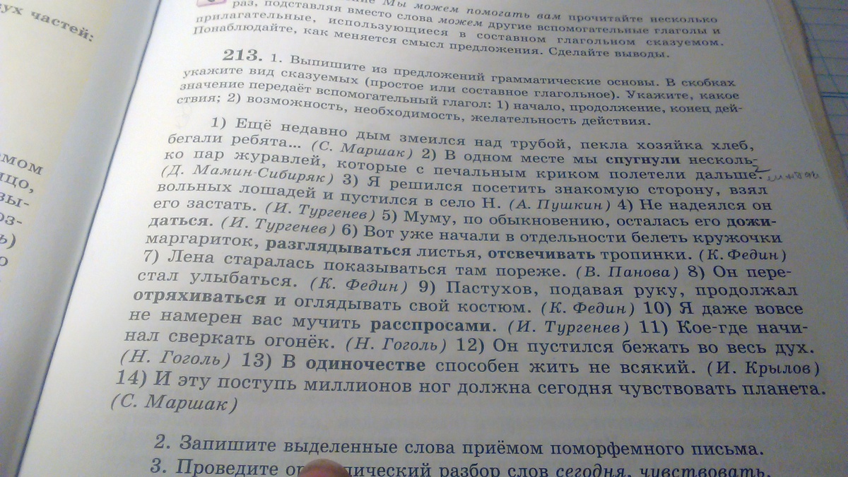 1. Дым-подлеж,змеился-сказуемое;хозяйка-подлеж, пекла-сказуемое,ребята-подлеж,бегали-сказ. 2. Мы-подлеж, спугнули-сказ.,которые-подлеж,посетили-сказ. 3. Я-подлеж,решился посеять,взял,пустился-сказуемые. 4. Он-подлеж,не надеялся застать-сказ. 5. Муму-подлеж, осталась дожидаться-сказ. 6. Кружочки-подлеж,начали белеть-сказ. 7. Лена-поддеж, старалась не показываться-сказ. 8. Он-подлеж,перестал улыбаться-сказ. 9. Петухов-подлеж,продолжал отряхиваться-сказ. 10. Я-подлеж, не намерян мучать вопросами(потому что фразеологизм). 11. Огонёк-подлеж,начинает сверкать-сказ. 12. Он-подлеж,пустился бежать во весь дух-сказ(потому что фразеологизм). 13. Всякий-подлеж,не способен жить-сказ.14. Планета-подлеж,должна чувствовать-сказ.