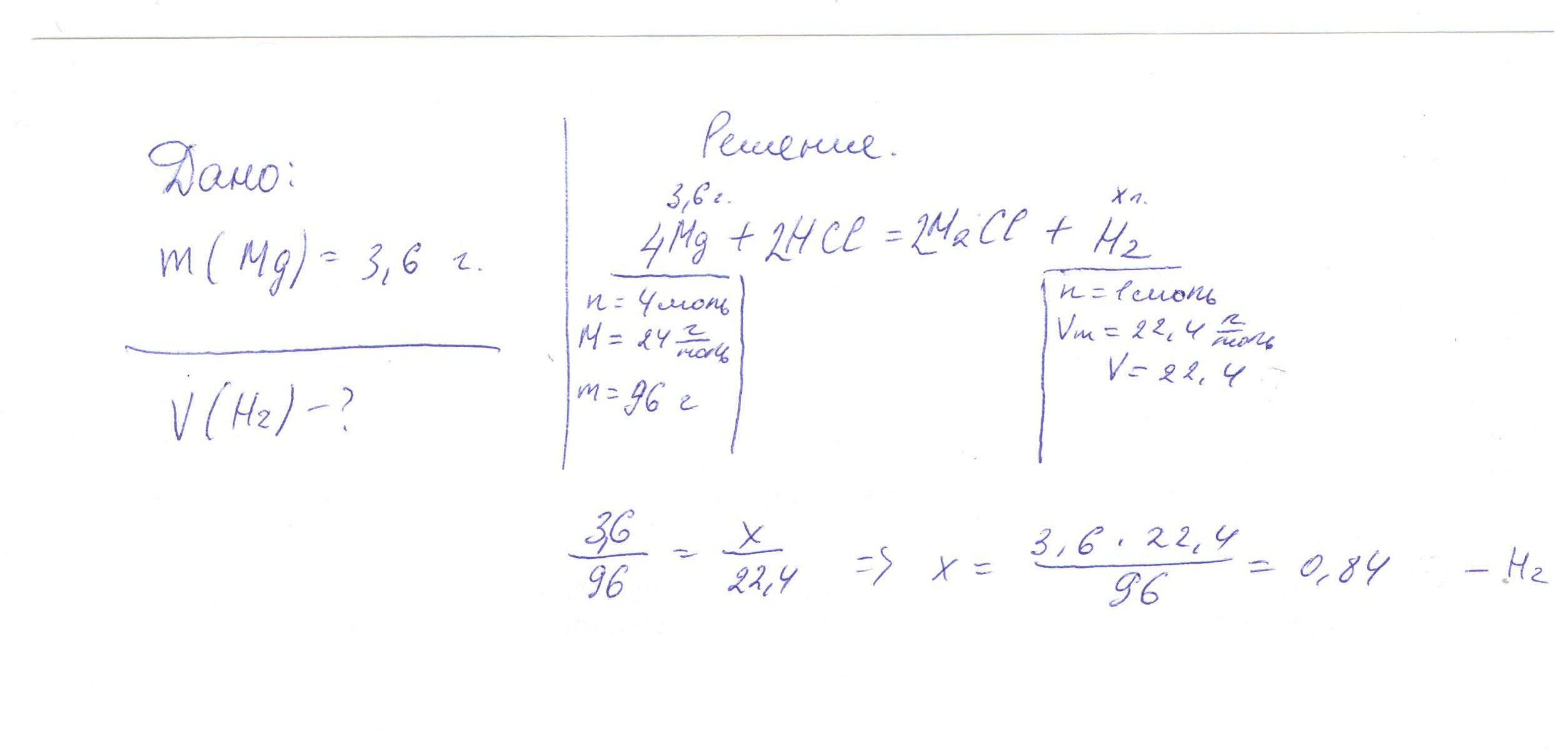 Задача по химии. В соляной кислоте растворили магний массой 3.6 грамм. Определите V выделяемого водорода.
