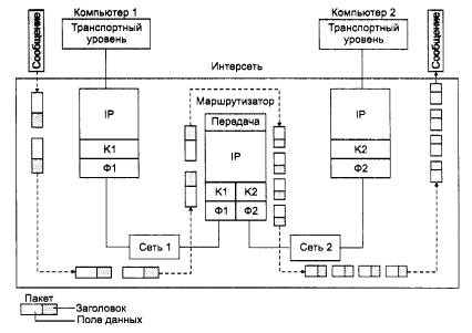 Рисунок: Фрагментация IP-пакетов при передаче между сетями с разным максимальным размером пакетов: К1 и 01 - канальный и физический уровень сети 1; К2 и Ф2 - канальный и физический уровень сети 2.