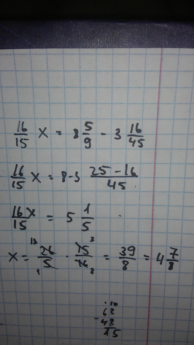 Проверка: 8 5/9 - 1 1/15 * 4 7/8 = 3 16/45