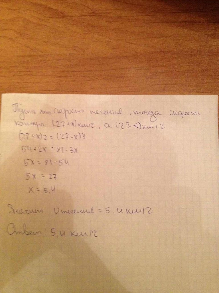 Катер прошел путь от A до B по течению реки за 2 часа, а обратный путь - за 3 часа. Найдите скорость течения реки и расстояние между A и B, если скорость катера в стоячей воде 27 км/ч.