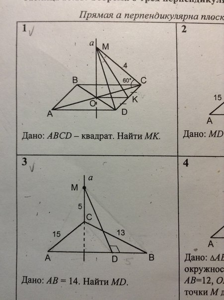 Пусть сторона квадрата равна х тогда .DК=КС=х/2 Рассмотрим треугольник OCD -прямоугольный и равнобедренный .Так как OD=OC из равенства треугл.OMD=OCD потому что OM-общяя (OD=OC) тк точка о делит диагонали квадрата пополам и диагонали в квадрате равны.Значит треугольник OMD=OCM по двум катетам .Следовательно если в треугольнике ODC K середина стороны CD OK-медиана и высота тк треугол.равноб .Значит OK=DK=KC тк тругол так же прямоугольный и медиана проведена из прямого угла к гипотенузе .Значит OK=x/2 В треугольнике ODC найдем OC через синус угла ODC .OC=X*(корень из 2)/2. Рассмотрим тругл.OMC тк угол OMC=30град то MC=x(корень из 2) .По теореме Пифагора найдем OM .OM=х(корень из 1,5).Рассмотрим тр OKM-прямоуг. тк а перпендикулярно квадрату .По теореме Пифагора MK=х(корень из 2)