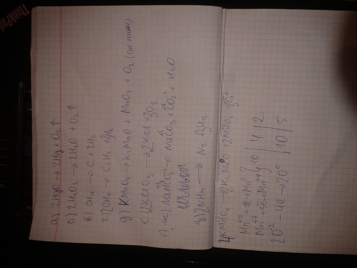 расставьте коэфиценты в схемах химических реакций: а) HgO→ Hg+O2 б) H2O2→ H2o+ O2 В)CH4→ C+H2 Г) CH4→C2H2+H2 Д)RMnO4→K2MnO+MnO2+O2 е)KCLO3→ KCL+O2 ж) NaHCO3→NaCO3+CO2+H2O з)NH3→N2+H2