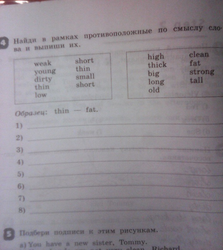 найди в рамках противоположные по смыслу слова и выпиши их. weak, young, dirty, thin, low, short, thin, small, short; high, thick, big, long, old, clean, fat, strong, tall.