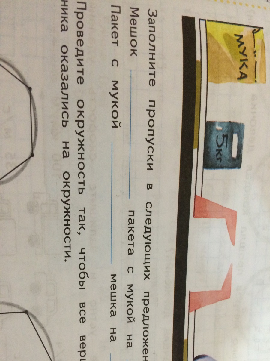 Заполни пропуски в следующих предложениях. Мешок......пакета с мукой на ....кг.