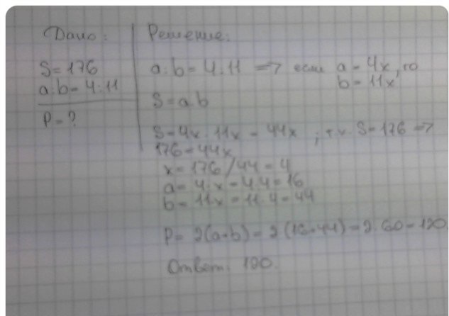 Найдите периметр прямоугольника, если его площадь равна 176, а отношение соседних сторон равно 4 : 11.