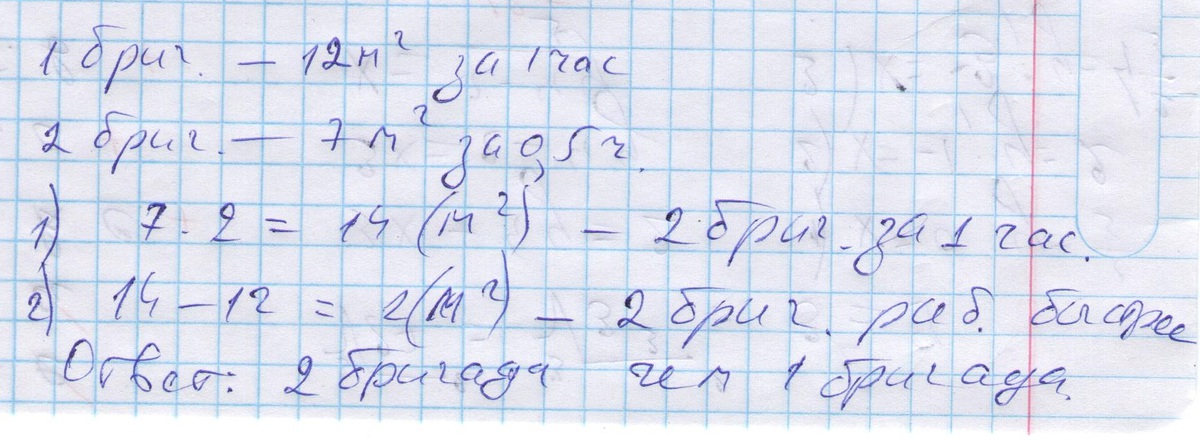 первая бригада делает 12 кв.м кирпичной кладки за 1 час а вторая 7 кв.м за 30 минут какая бригада работает быстрее