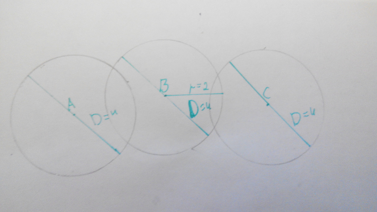 1. Постройте окружность с центром в точке А и радиусом, длинна которого равна 2см. Постройте ещё две окружности с тем же радиусом и центром в точках. Заранее спасибо!