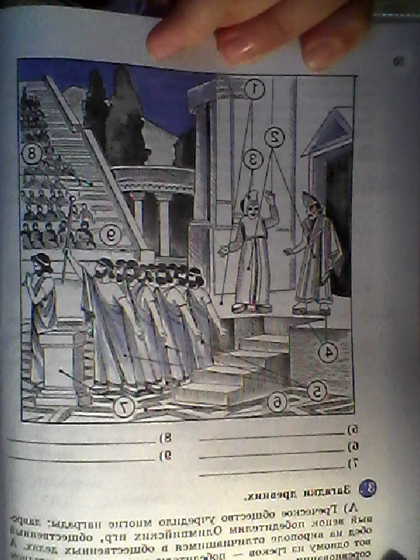 1.Скене - постройка, примыкающая к орхестре, на ней размещались декорации. 2.Орхестра – круглая площадка с жертвенником или статуей Диониса посередине. 3.Места для зрителей. 4.Лестницы, разделяющие места для зрителей на клинья.