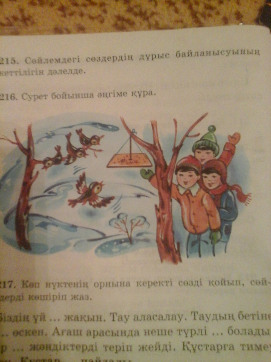 Айнала аппак кар. кун суык. айбол, Нурлан, Дидар ойнап журип жаурап турган кустарды корди. олар биригип кустарга жемсауыт жасап жем шашты. Тойып жылынган кустар канаттарын кагып ойнап жур.